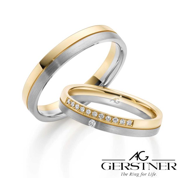 Ringe i 2 farvet Alm Guld og Palladium Legeret Hvidguld, i dameringen er der 12stk glinsende brillanter.